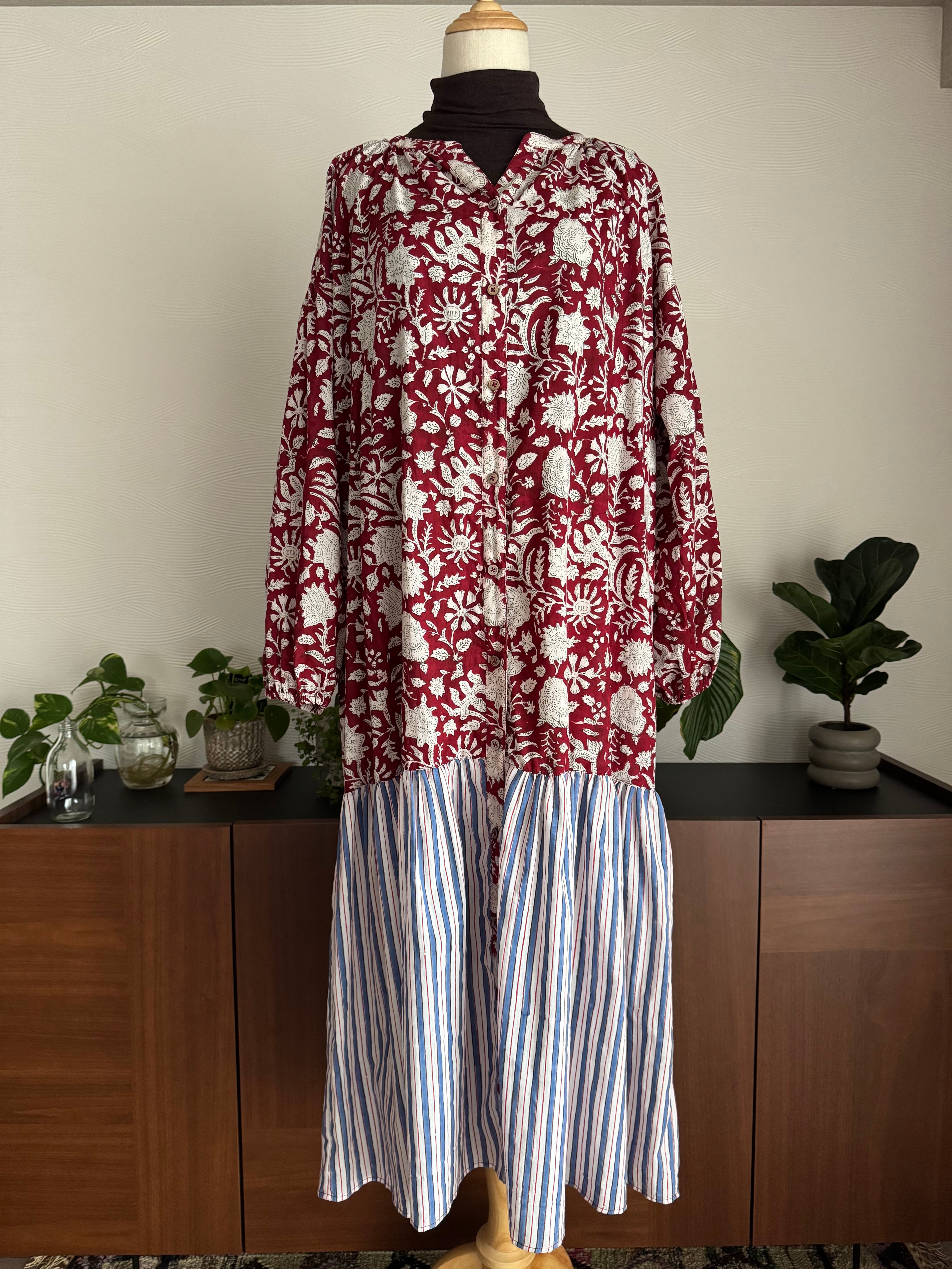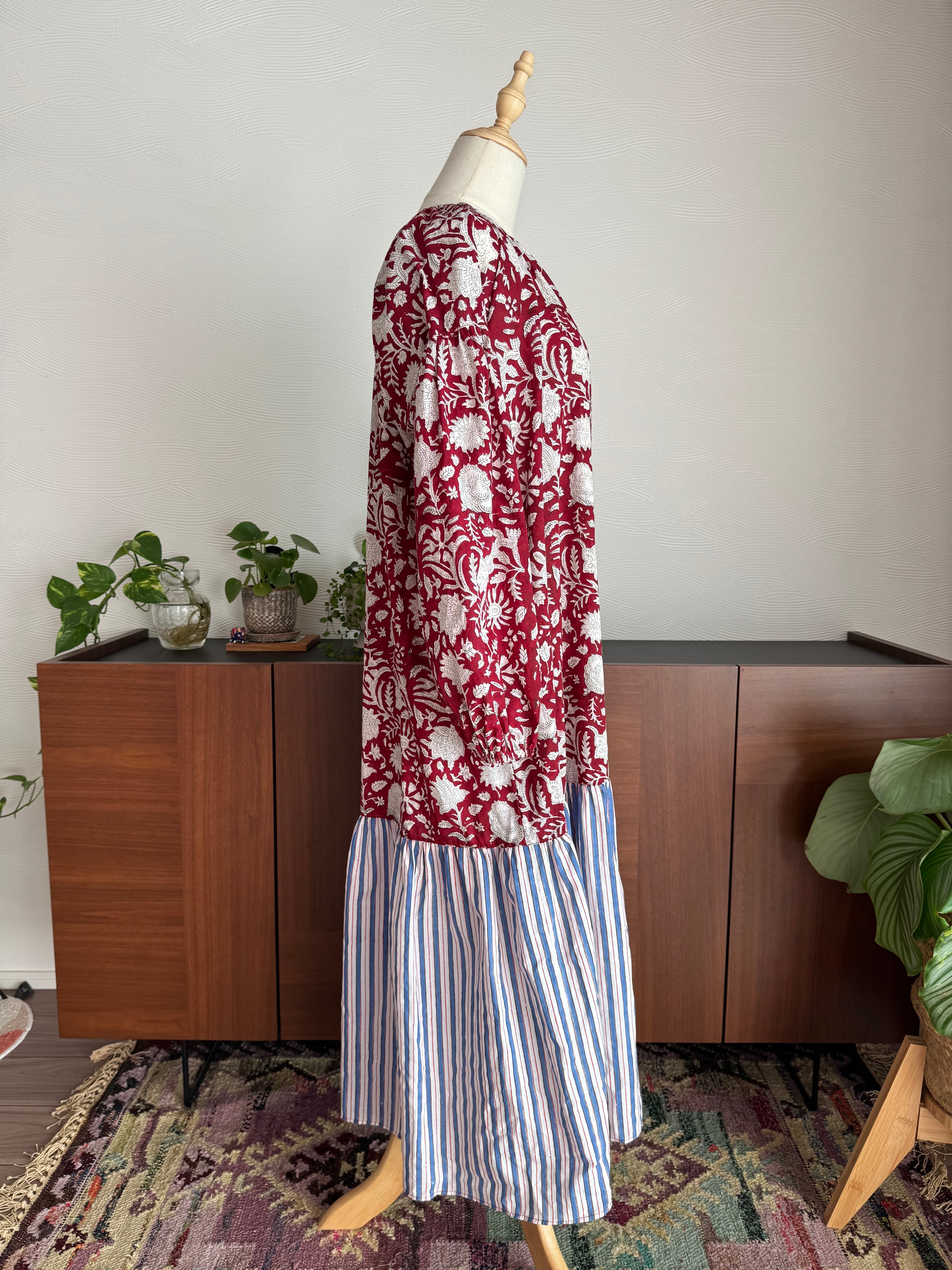 深みのあるボルドー地に咲く白い花々と、裾のストライプ切り替えが印象的。